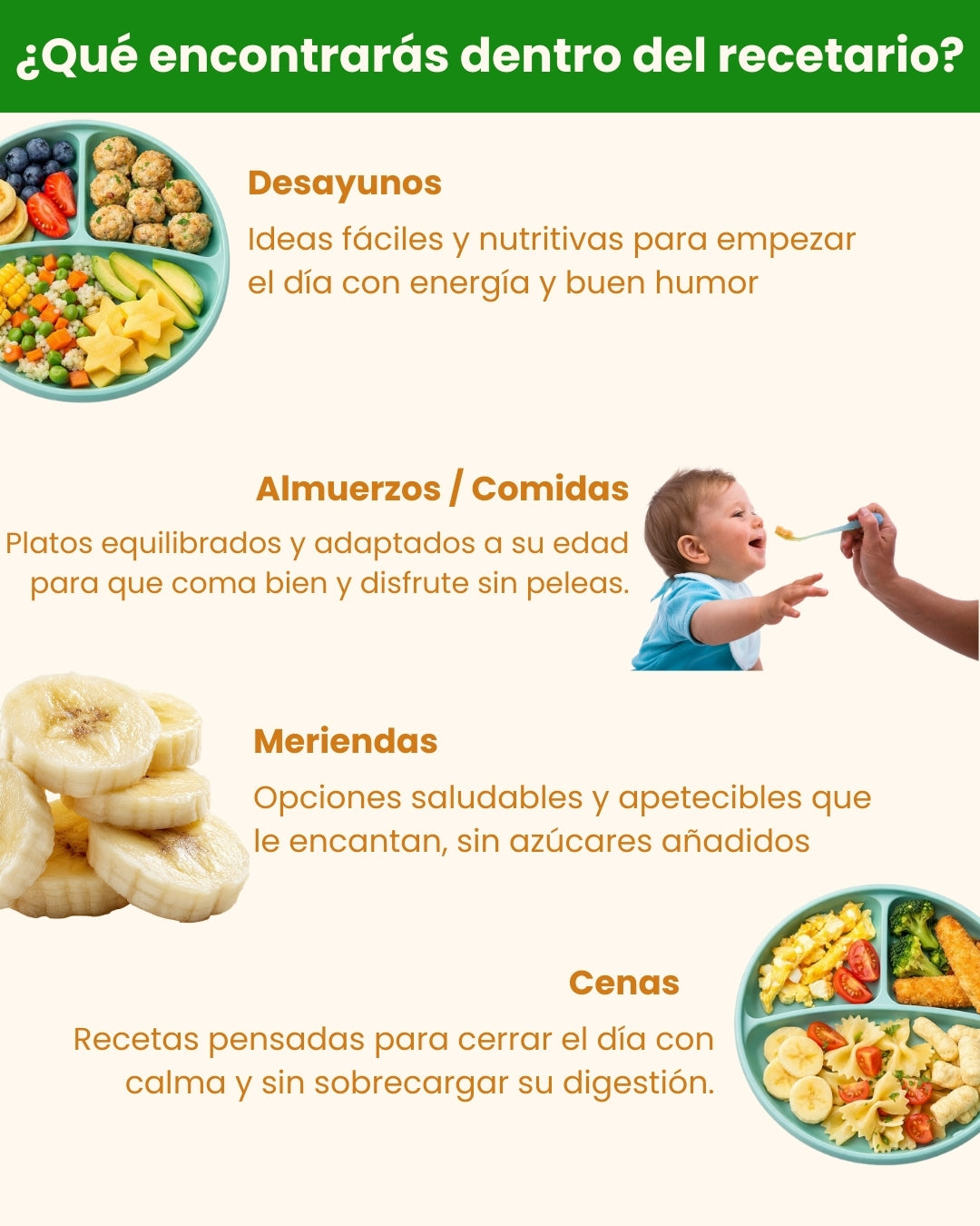 Sí. Todas las recetas están adaptadas por edades desde los 6 meses, con alimentos y texturas seguras para cada etapa. Aquí no hay improvisaciones: todo está pensado para bebés reales.